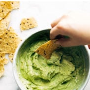 This avocado dip is ultra-creamy, with a boost of tang and protein and some friendly probiotics from the yogurt. The flavor is tangy, salty, and super satisfying. It’s something that can materialize almost instantaneously when you need something happy to eat STAT. You don’t even need to dirty up a cutting board (unless you want cilantro, which, yes, is delicious).