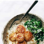This feels-like-a-fancy-restaurant meal combines the love that is a pile of creamy Parmesan risotto (with a splash of white wine bcz this is a fancy restaurant, remember?) and seared scallops, garlic sautéed greens, and THEN, like we weren’t already 😍😍😍 enough, the brown butter gets drizzled all up on top of everything. Just so you can go to heaven and back again in one bite.