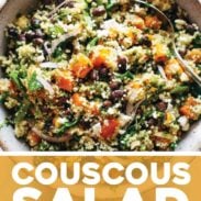 A bright, zippy, unexpectedly delicious couscous salad that’s packed with sweet potatoes, black beans, spinach, feta, and more – all tossed with a life-changing lime basil vinaigrette!