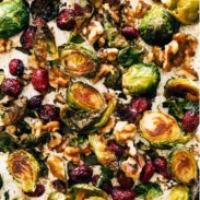 Let’s talk about these roasty, sweet, nutty brussels sprouts that combine those tender-crisp, whole-brussel bites with the ultra thin and crispy leaves, all coated with a lil’ mustard-maple drench and speckled with juicy bites of dried cranberry. Oh my gosh. WHY ARE THEY SO GOOD.