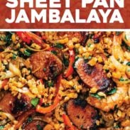 Sheet Pan Jambalaya: maximum flavor, minimal dishes. Sausage, peppers, onions, shrimp, and cauliflower rice all roasted up on a sheet pan. Big flavor, easy dinner!